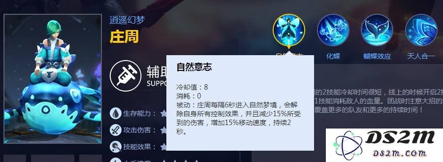 技能介绍:庄周的“清梦浮云”不仅可以恢复生命,还可以解除控制效果。