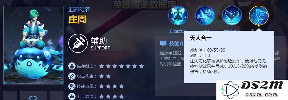 技能概述:庄周的终极技能“梦游千里”可以制造梦境,使敌方无法移动,还附带伤害。