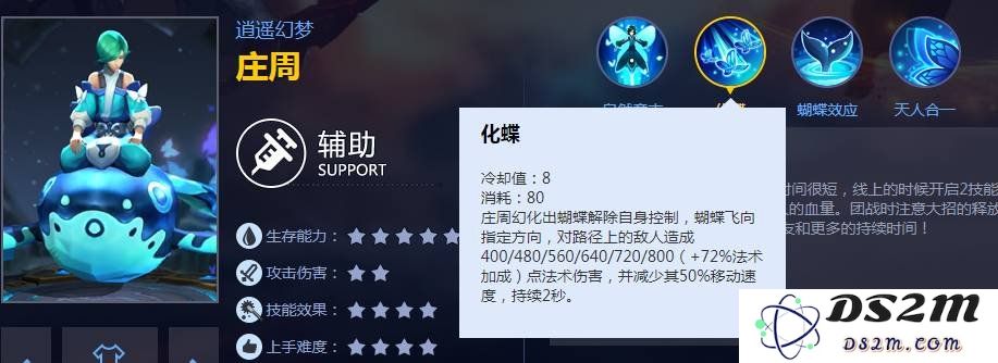技能简介:庄周的第一个技能“梦之涟漪”可以对敌方造成伤害,并附带一定减速效果。